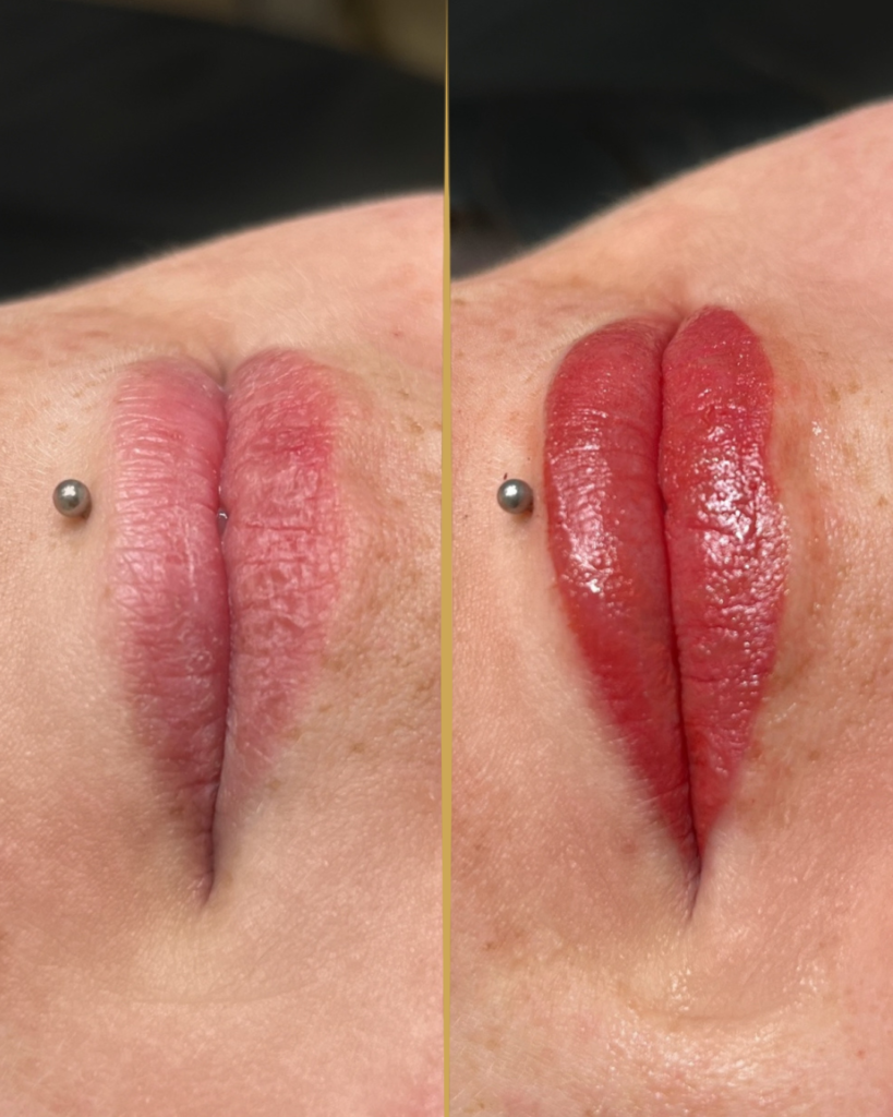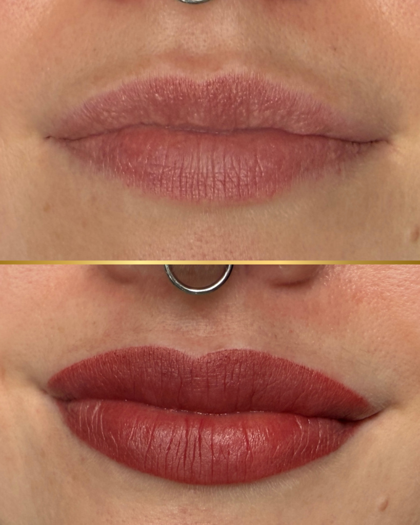 Lip blush is designed to enhance and define your natural lip shape. This technique will even out the lip tone and bring out the lip border, enhancing symmetry and creating a balanced look, so you’re ready to just gloss and go! It’s ideal for those who want a soft flush of colour all over the lips, rather than focusing solely on the borders.